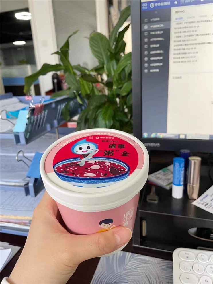 陕西彬县由于疫情防控需要,当地只有几家餐饮门店营业,无法订到现煮热粥。彬县国祯行政人员为了让厂区职工喝上应季的“腊八粥”,克服重重困难于1月9日23点采购到听装八宝粥。